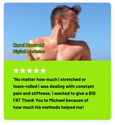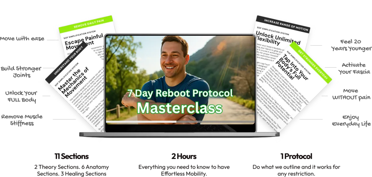 You are getting a copy of the Exclusive 7 Day Reboot Masterclass, available instantly. You are getting the highly praised Joint Code guide. You are getting our Unconscious Stability Programming. You are getting our Pinpoint & Release Protocol for immediate relief. You’re getting our Perfect Warmup protocol to get fast activations of the right muscles for any given movement.
