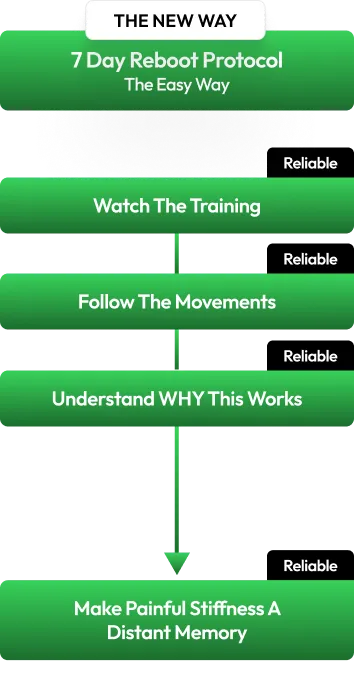The 7-Day Reboot is a solution to the common problem of not being able to find lasting relief from pain and stiffness. We are able to completely rewire the body for longterm relief, as well as use effective touchpoint relief for fast tension release.